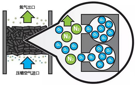 改善機房環(huán)境,夏天要改善通風(fēng)系統(tǒng),寒冬要增加制曖條件,確保機房的環(huán)境溫度在合理范圍以內(nèi)。壓縮空氣中的水分含量(壓力露點)對制氮機/碳分子篩有直接影響,所以制氮機對前端的壓縮空氣的品質(zhì)有著嚴(yán)格要求。案例一:某用戶因為空壓機的儲氣罐沒有安裝自動排水器,也沒有定期排水導(dǎo)致冷干機進氣含濕量大,而冷干機進出氣口的三級過濾器也沒有安裝排水器和定期手動排水,導(dǎo)致系統(tǒng)含水量超高,造成了安裝在后端的活性炭過濾器吸水結(jié)成塊狀堵塞壓縮空氣管道,進氣壓力降低(進氣量不足)導(dǎo)致制氮機純度不達標(biāo)。通過改造后增加排水器系統(tǒng),問題得到解決。案例二:某用戶的冷干機分水器不好,導(dǎo)致冷卻后的水得不到及時分離,大量液態(tài)水進入制氮機后,電磁閥一周內(nèi)壞了2個,角座閥活塞內(nèi)部全是液態(tài)水,造成活塞密封件腐蝕導(dǎo)致閥門動作不正常,制氮機無法正常工作。更換冷干機后,問題得以解決。1)碳分子篩表面有微孔,用于吸附氧分子(如圖示),當(dāng)壓縮空氣中含水量過重會引起分子篩的微孔收縮和分子篩表面粉塵脫落,進而堵篩微孔,造成單位重量的碳分子篩無法產(chǎn)出額定需要的氮氣流量和氮氣純度。2)建議用戶在制氮機入口增加吸附式干燥機,降低壓縮空氣的含水量,確保碳分子篩不被重油、重水污染,一般可延長分子篩3-5年的使用壽命(根據(jù)純度高低)。1)任何型號/形式的分子篩,都是通過分子篩表面的微孔加壓吸附篩除不需要的成份,得到我們需要的物質(zhì)。但是所有的分子篩都害怕油污染,殘油的污染對分子篩是完全不可逆的污染,所以制氮機入口有嚴(yán)格的含油量要求。2)如上圖,油污會覆蓋分子篩表面的微孔,導(dǎo)致氧分子無法進入微孔被吸附,造成制氮量下降,或者在保證原有流量前提下,5年內(nèi)就會出現(xiàn)氮氣純度不合格的現(xiàn)象。以上問題改善方法: 注意機房通風(fēng)、降低環(huán)境溫度、減少壓縮空氣中殘油量;通過冷干機、吸干機、過濾器、活性炭除油器加強保護;定期更換/保養(yǎng)制氮機前端設(shè)備,保證壓縮空氣的品質(zhì),可大大保護、延長制氮機的使用壽命和碳分子篩的性能。綜上所述:機房環(huán)境溫度、壓縮空氣的含水量及含油量等外部因素會影響制氮設(shè)備的性能,尤其是制氮機前端的冷干機、吸干機、過濾器會直接影響制氮機的使用效果,所以選擇優(yōu)質(zhì)、高效的干燥機設(shè)備,對制氮機尤為關(guān)鍵。很多制氮機廠家沒有生產(chǎn)前端的壓縮空氣凈化設(shè)備,當(dāng)制氮系統(tǒng)出現(xiàn)故障時,容易出現(xiàn)制氮機廠家與干燥機廠家相互推諉、互不擔(dān)責(zé)的現(xiàn)象。伊普思作為一家卓越的壓縮空氣系統(tǒng)產(chǎn)品供應(yīng)商,旗下有完善的產(chǎn)品鏈,能給客戶提供自主研發(fā)制造的冷干機、吸干機、過濾器、制氮機等一整套設(shè)備,優(yōu)質(zhì)的壓縮空氣凈化產(chǎn)品配備優(yōu)質(zhì)的制氮機,讓客戶買得安心、用得放心!